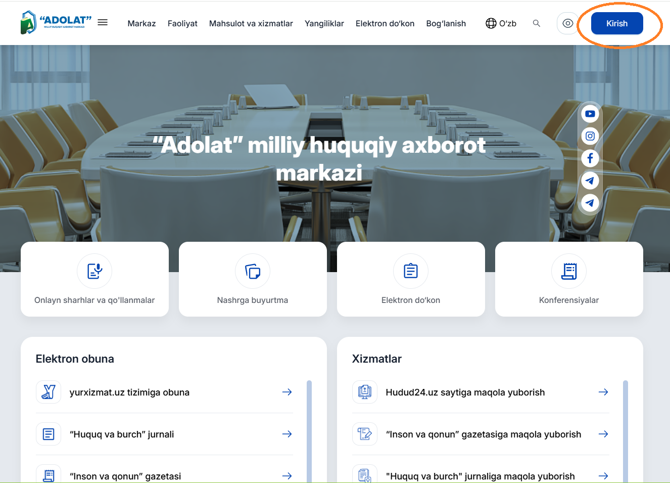 Бунинг учун adolatmarkazi.uz сайтига ташриф буюриб, сайтнинг юқори қисмидаги “кириш” тугмаси босилади ҳамда сизга берилган логин ва паролни киритиб “кириш” тугмаси босилади.