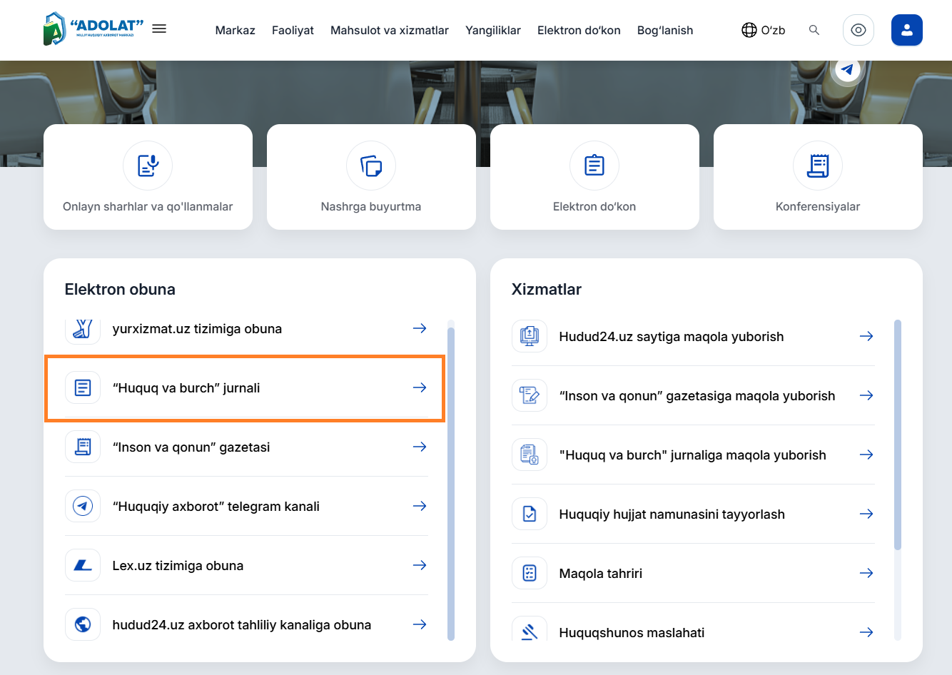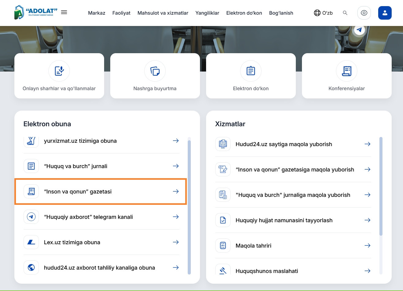 “Адолат” миллий ҳуқуқий ахборот маркази сайти орқали “Инсон ва қонун” газетаси ҳамда “Ҳуқуқ ва бурч” электрон обуна бўлиш имконияти билан танишинг!